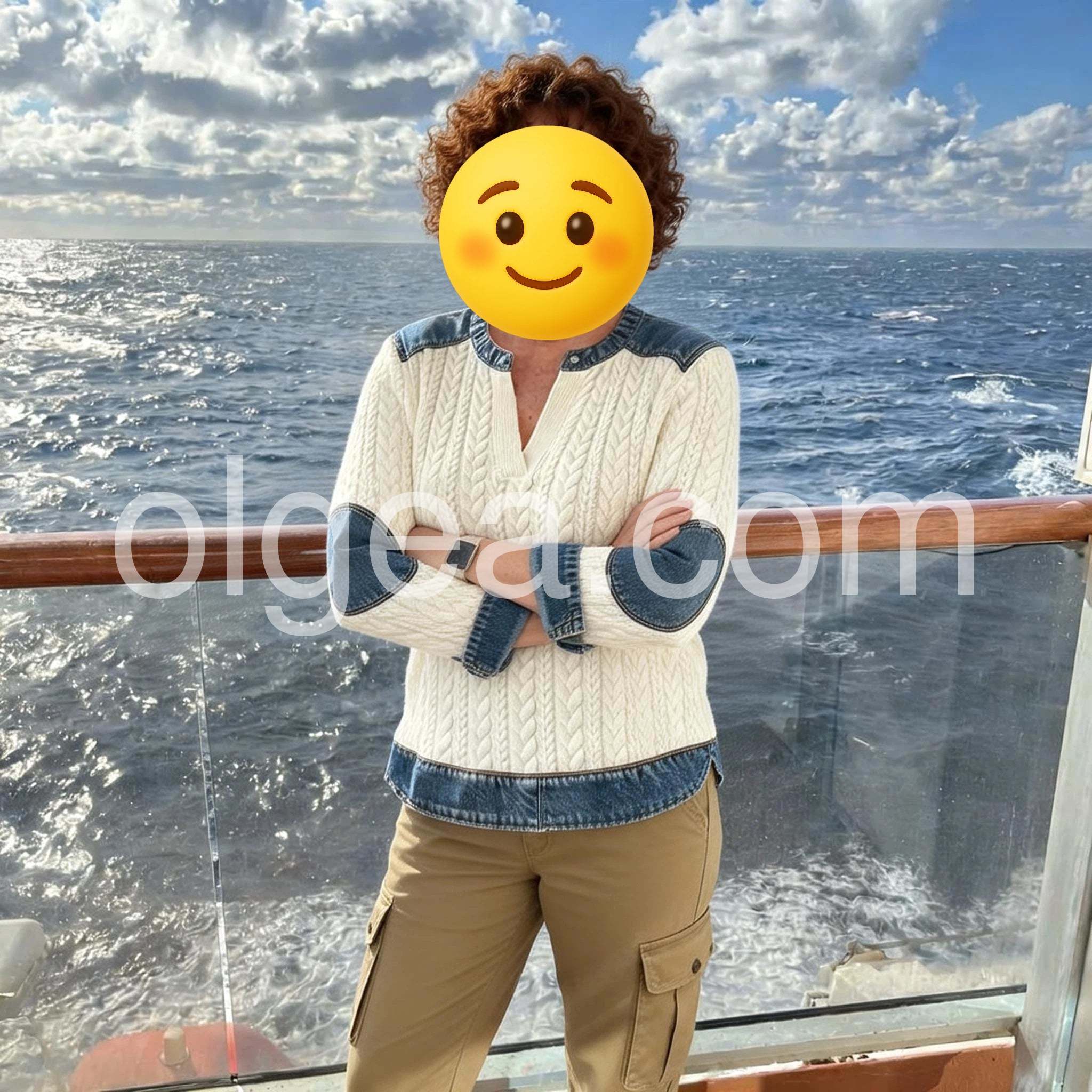 I'm obsessed with this white cable-knit sweater with the denim accents--it's the perfect balance of cozy and chic. The texture is so rich, and the denim patches add just the right amount of edge. I can see myself wearing this on casual days and layering it under a blazer for a smarter look.