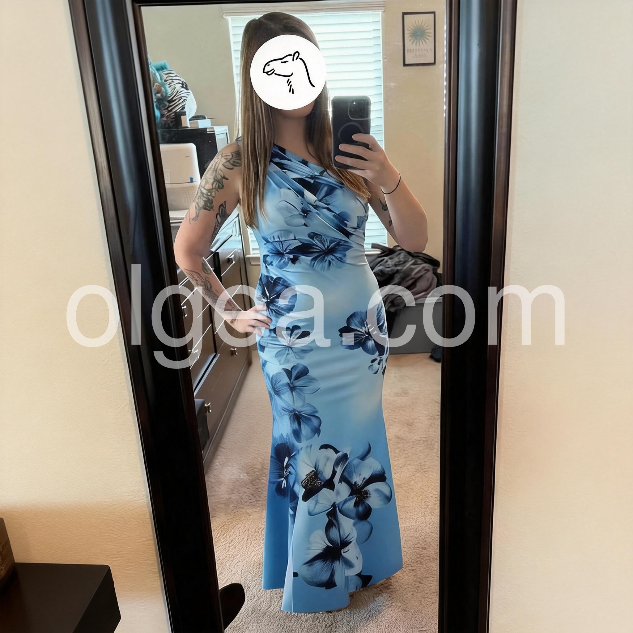 I felt so glamorous in this! The gradient blue tones and the large flowers are just striking. It is form-fitting in the best way possible. Perfect for a tropical getaway or resort evening.