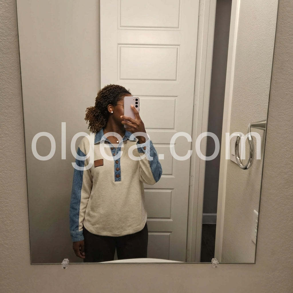 I absolutely love this top! The denim details on the sleeves and collar give it such a unique look. It is super comfortable and fits perfectly. Great for casual weekends.