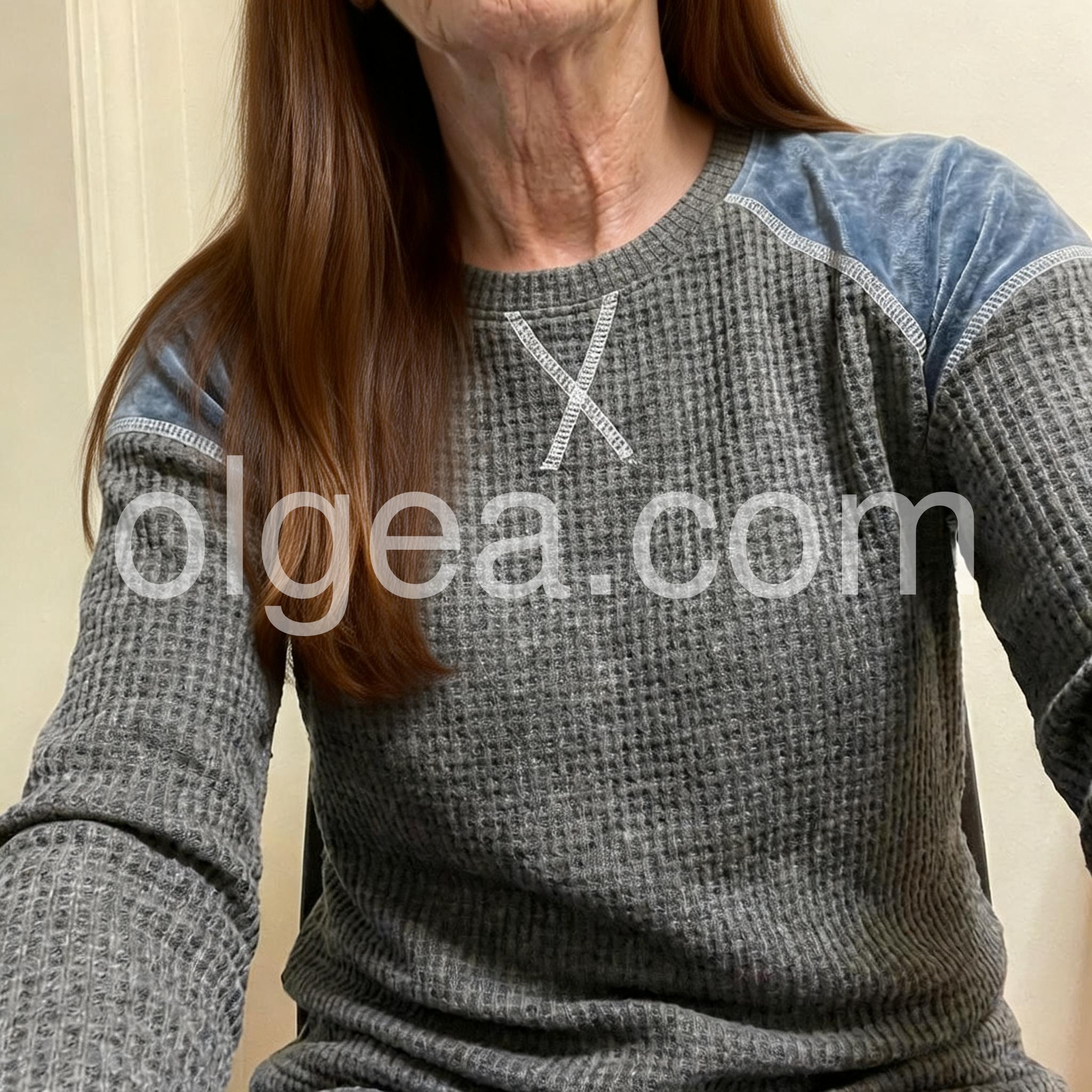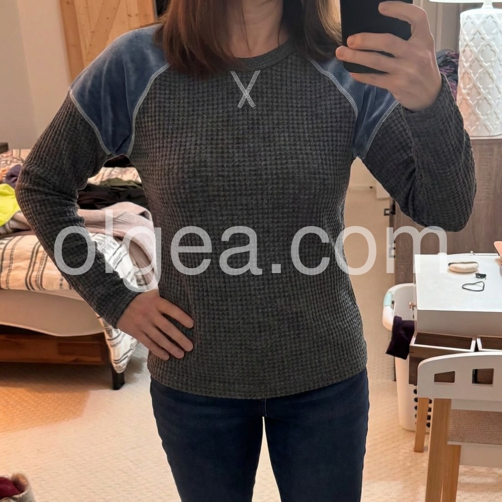 I love the contrast between the grey waffle knit and the soft blue velvet shoulders. It is so unique and comfortable!